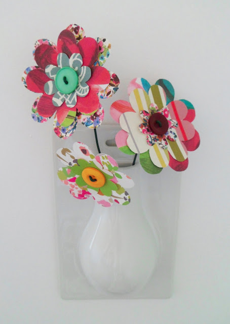 6// Once you have your flowers play around with what colour and patterns work well together and then pick a button for the center. Just remember that you need your wire to fit through the button holes.